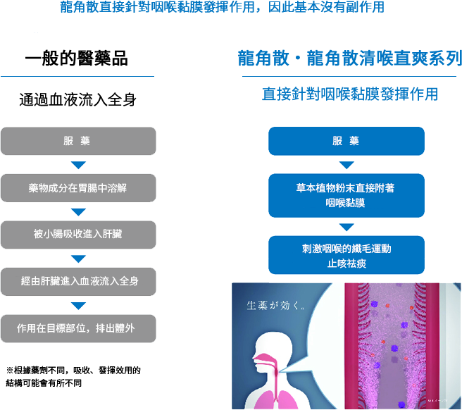 • 龍角散直接作用於咽喉黏膜發揮藥效