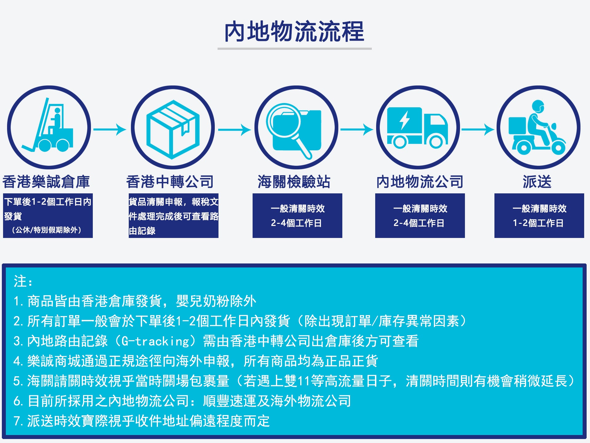 當收到您的訂單後,本公司會盡快處理發貨事宜,以確保您盡快收到已購買的產品。然而,運送時間或會受到個別地區的進口法例、送貨方式、航運安排、天氣、突發事件、當地假期或節慶等因素影響。所有列明的送貨時間均為預計運送時間,我們並不對貨品因海關政策或關稅而引起的運送延誤而導致的貨品損壞或損失負上任何責任。本公司的辦公時間為香港時間星期一至五,早上九時至下午一時及下午二時至晚上六時,香港公眾假期除外。星期一至五的訂單將於三個工作天內處理及付運;星期六、日及公眾假期的訂單則會於緊接的工作日處理及付運。為保障於本網站上購物的客戶安全利益,首次購物的訂單均需與銀行一再核實信用卡資料才可付運。因此,訂單的付運時間有可能較一般訂單更長,期間閣下可登入「我的帳戶」查看訂單處理狀況。