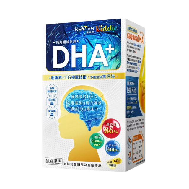 「Revive 深海極純魚油DHA+」,純度高達86%之醫療級DHA,採用rTG萃取技術,提升吸收率達300%^。嚴選來自秘魯純淨深海水域,只選用小型魚種,從源頭到生產,確保魚油純淨、無有害污染。每食用份量*提供250毫克DHA,支持兒童腦部及眼睛的發展。天然檸檬、無魚腥味,細細粒,咀嚼軟膠囊可直接吞服,特別適合嬰兒、學齡兒童至青少年每天服食。紐西蘭製造,品質保證