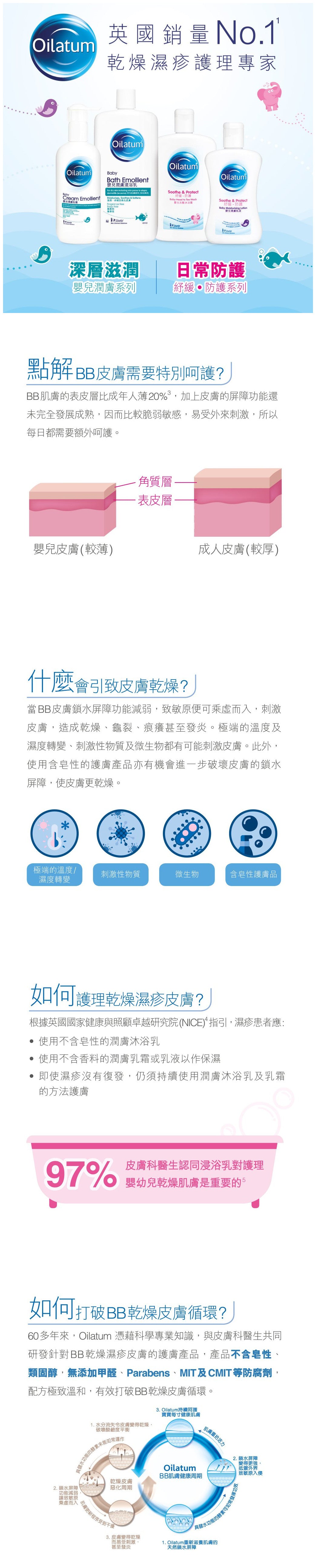 Oilatum®嬰兒潤膚浸浴乳專為嬰兒及小童的乾燥、以至濕疹皮膚研制。配方能與水融合,仿如牛奶浴一般,紓緩乾燥肌膚。能於皮膚表面形成潤膚保護膜,有助減少水分流失,並能滋潤、紓緩及乾化肌膚。有助保護皮膚並預防乾燥。Oilatum®嬰兒潤膚浸浴乳能有效潔淨全身及乾燥部位,毋須再用肥皂或梘液。